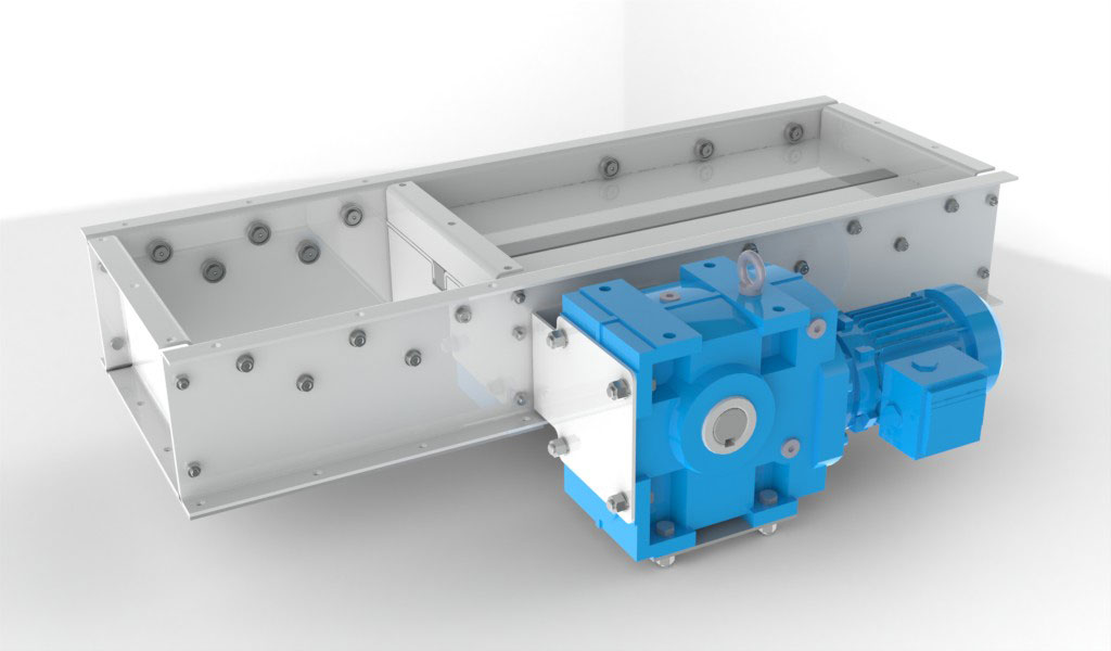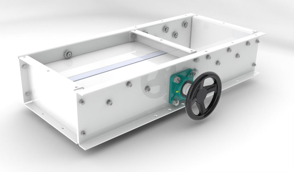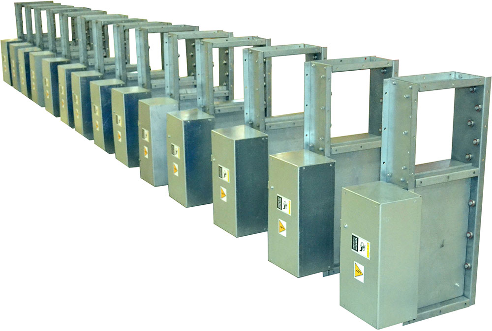 Motorised slide valves are used to channel grain. They are controlled by magnetic sensors.